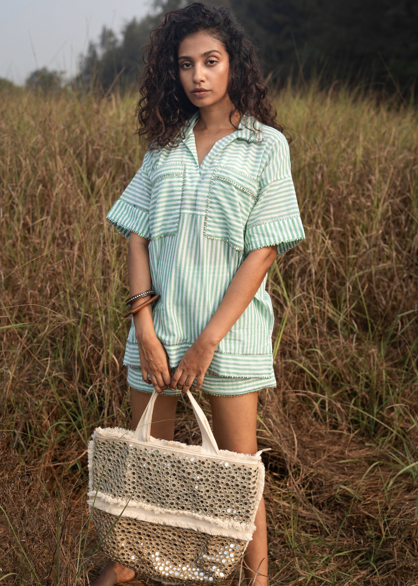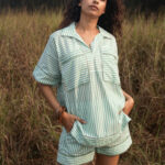 Of undeniable ease and style. The Grassy Shorts Set is highlighted by its boxy shirt and easy-going shorts. Stripes and minimalist Gota bring this all together. Did someone say Beach Day?