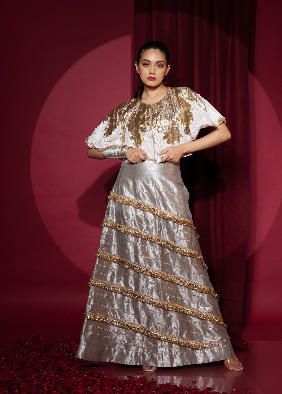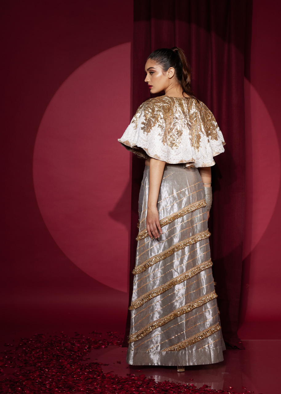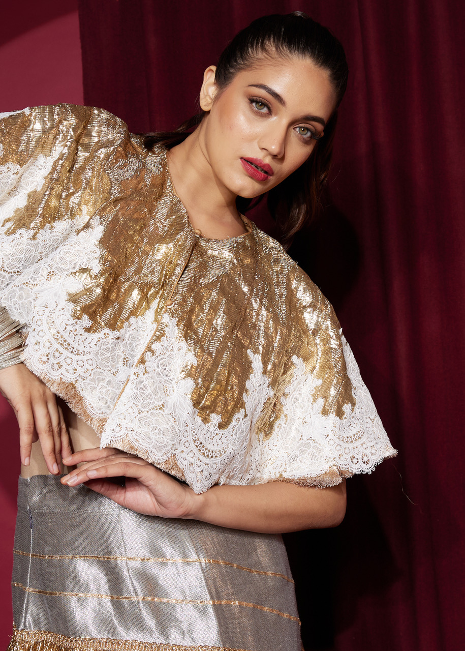 A surprising twist on Gota, this meticulously patched Gota cape gets a vintage victorian edge with a hand patched fine lace , edged with a luscious rosegold fringing. It’s softly feminine and reminiscent of the 30’s classical and theatrical styling- a delightful mix of old and new in every way. Every item has it’s own unique patchwork, and acquires a beautiful patina over time- making each piece uniquely it’s own.