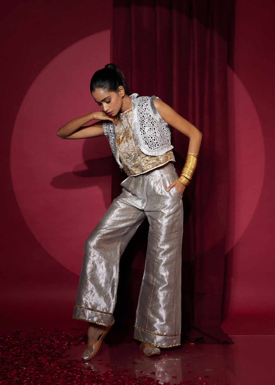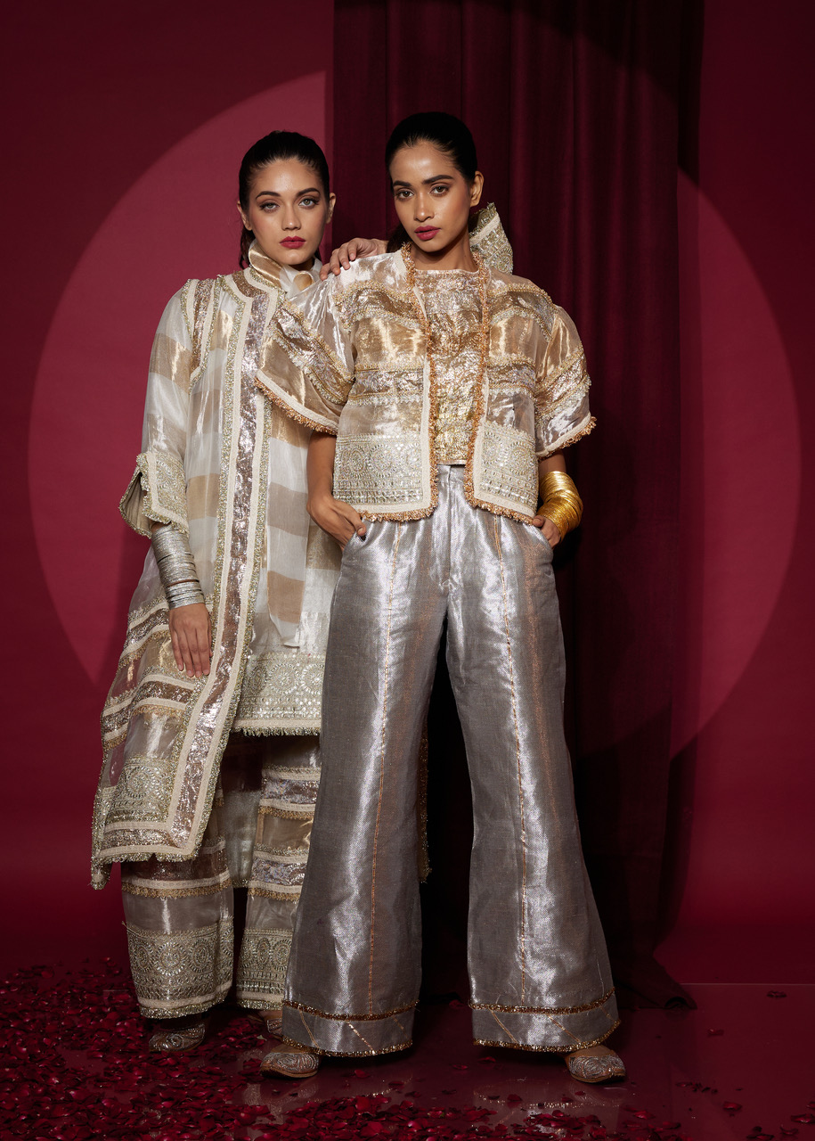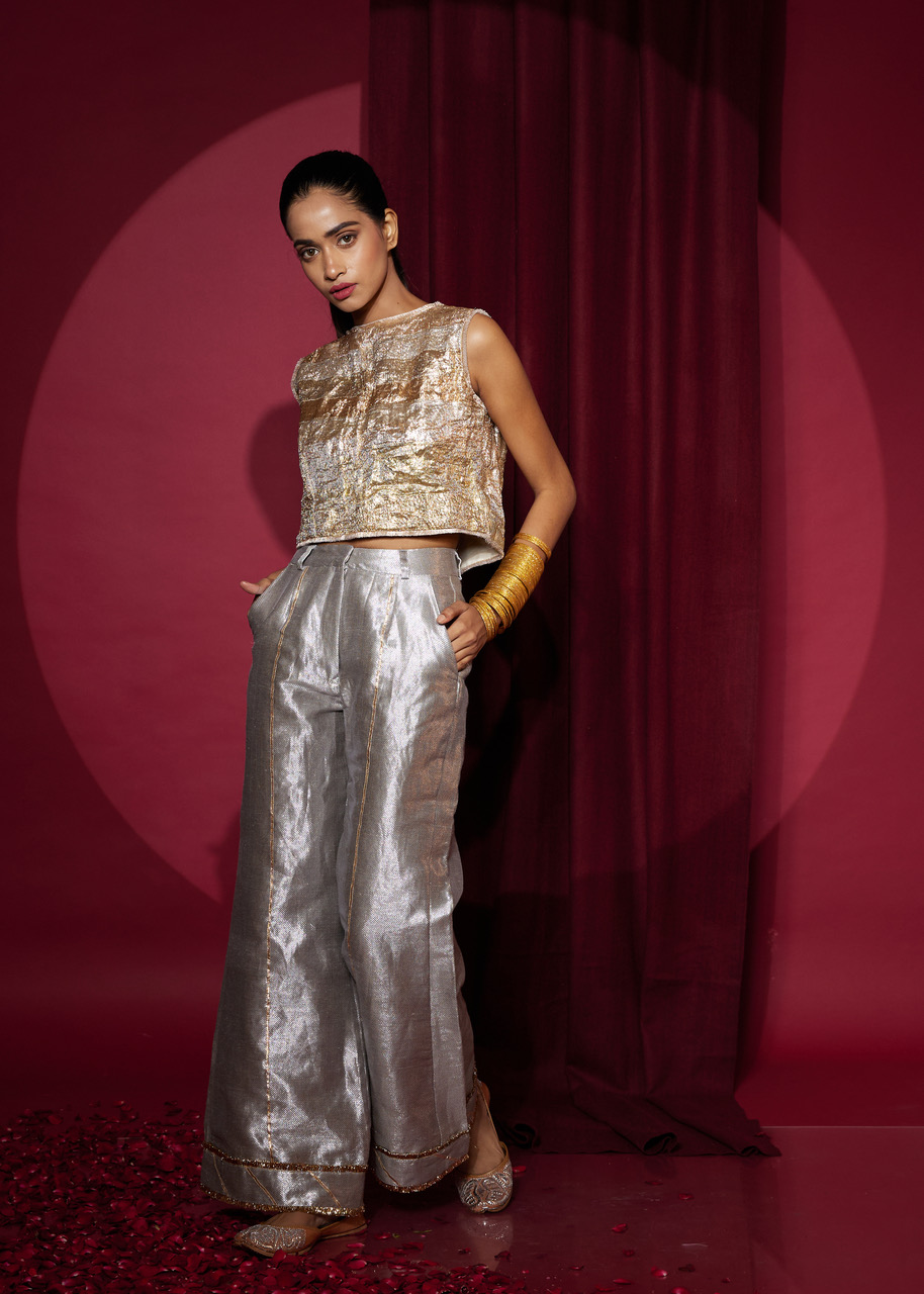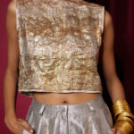 Modern and avant-garde, the Lashkara Crop Top balances Indian and Western aesthetics. Crafted from pure gota, and handmade so that each piece is unique, this top will acquire a beautiful patina over time.