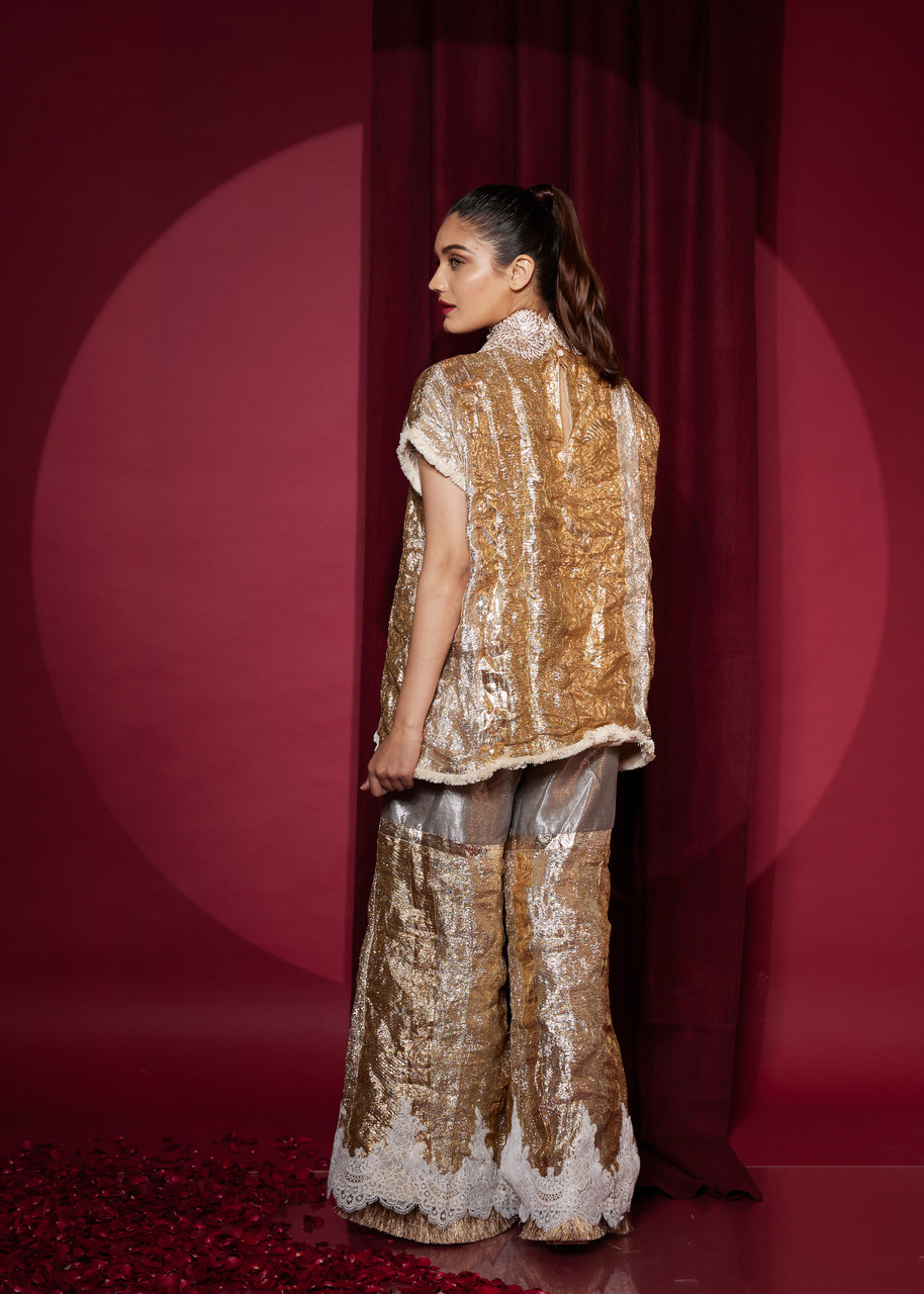 A surprising twist on Gota, this meticulously patched Gota Pant gets a vintage victorian edge with it’s gorgeous hand patched fine lace, edged with a luscious rosegold fringing. Lined with smooth cotton, it’s softly feminine.