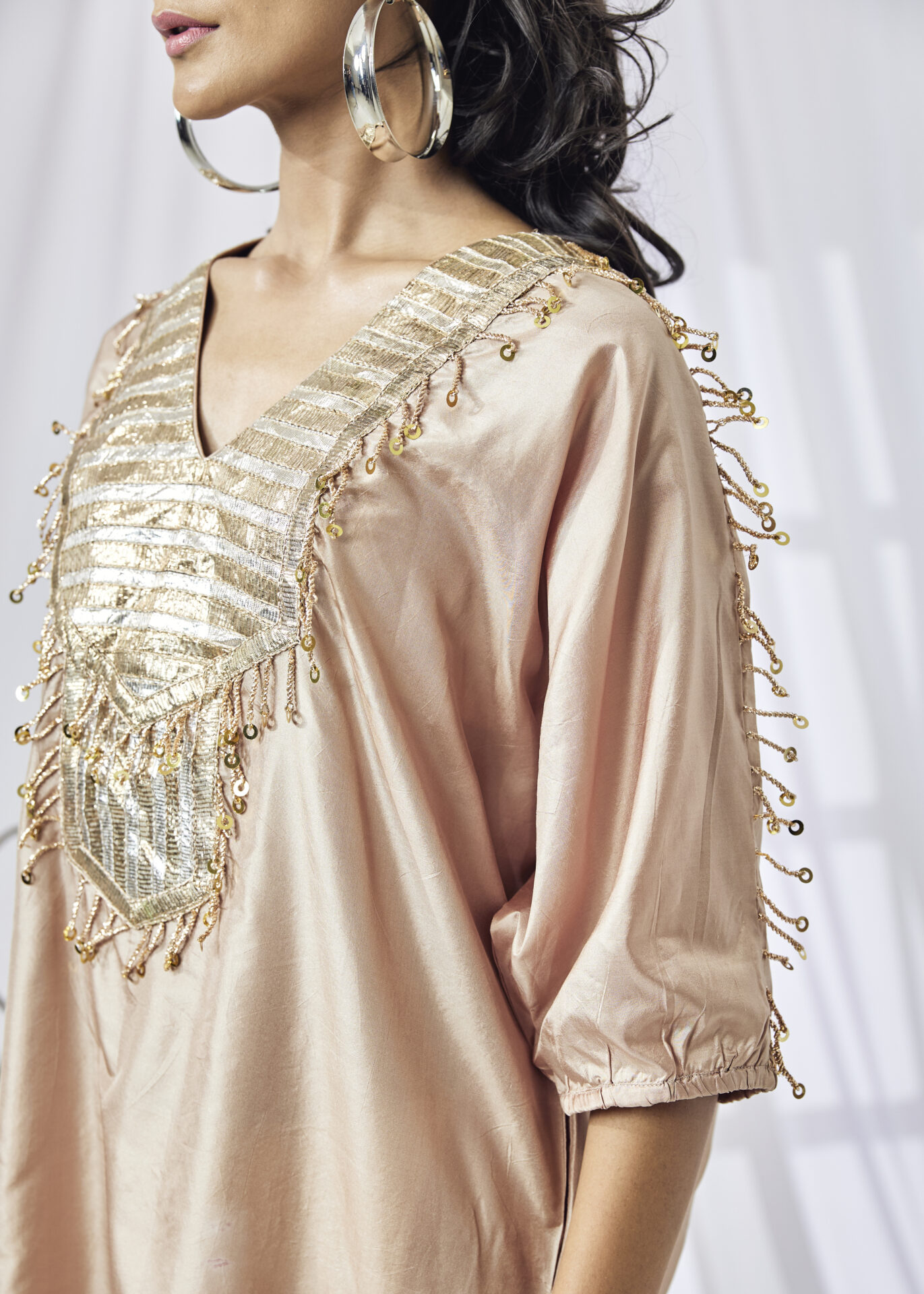 An anti-fit essential that can transform your festive wardrobe. The versatile Silk Kaftan Long Shirt is highlighted by the pure gold work on the yoke with Zardozi fringing. Easy to dress up or down ā wear it as a dress or pair it with pants!