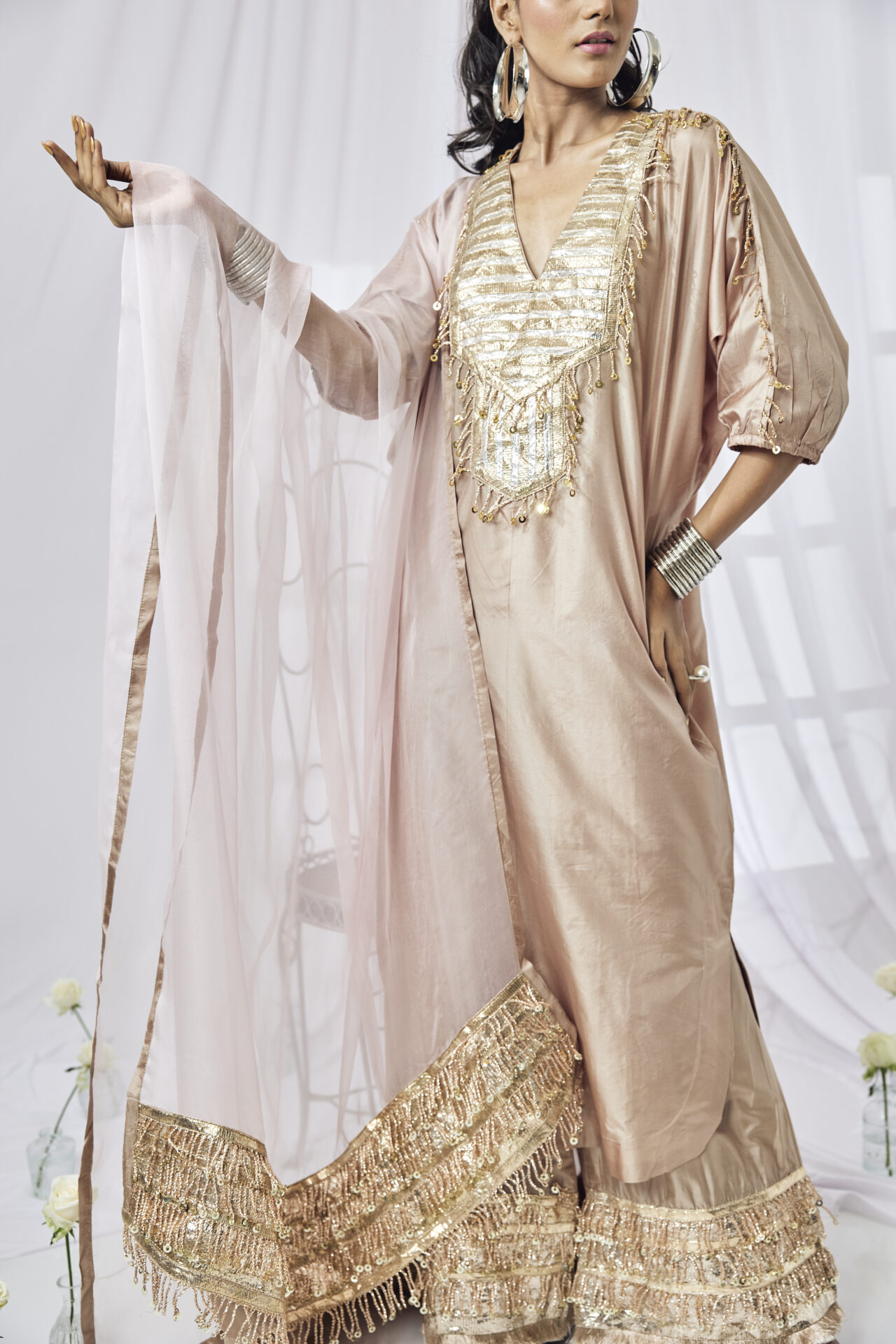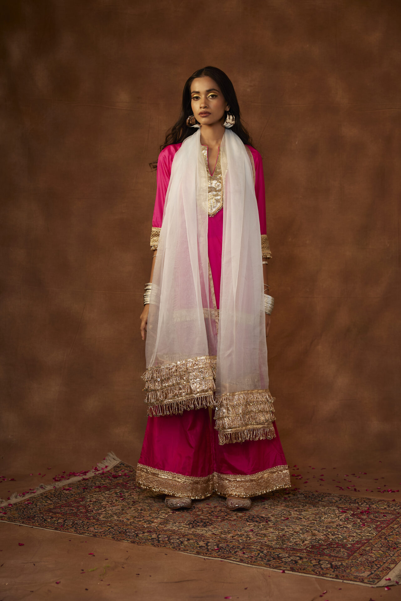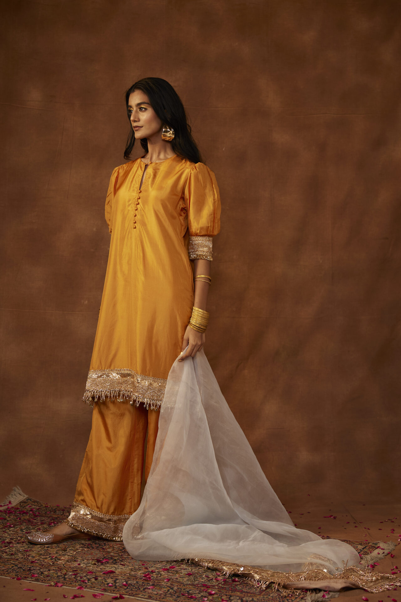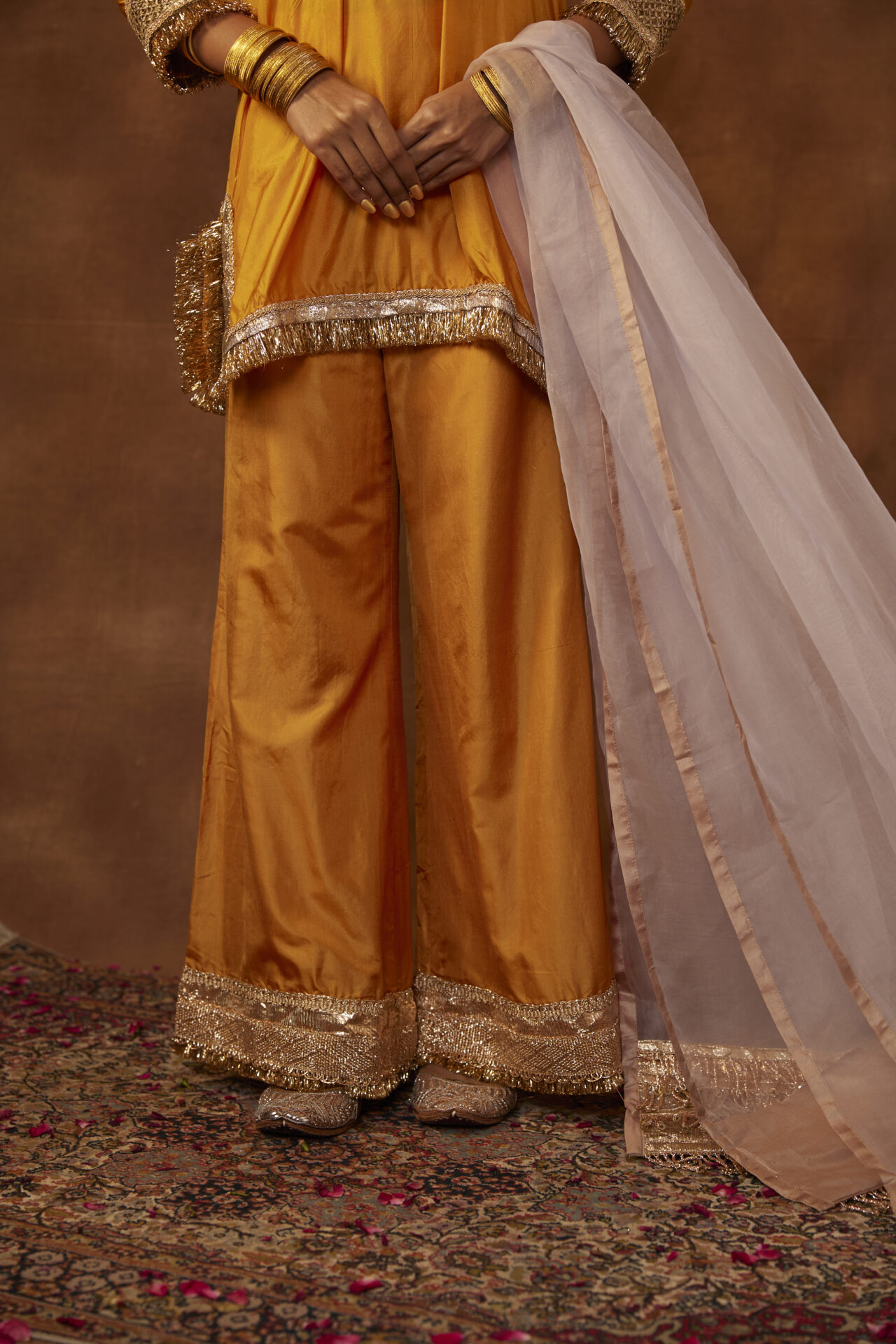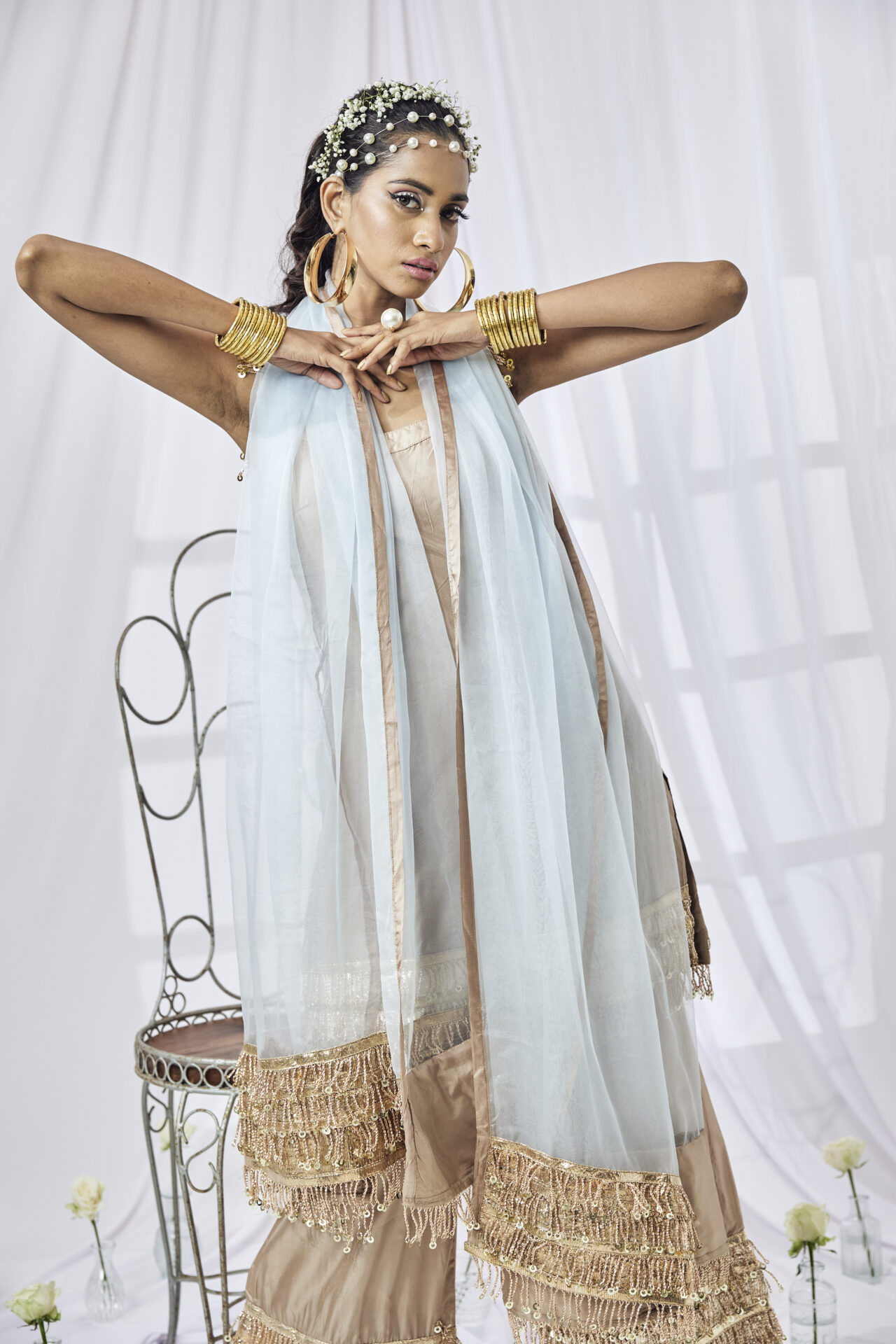 A sheer dupatta that exudes elegance, the Soni Dupatta is crafted from silk organza and is highlighted by pure Gota and Zardozi work as well as gold edges. The extra-long dupatta adds old-world charm to your outfit, and can even be draped as a shawl.
