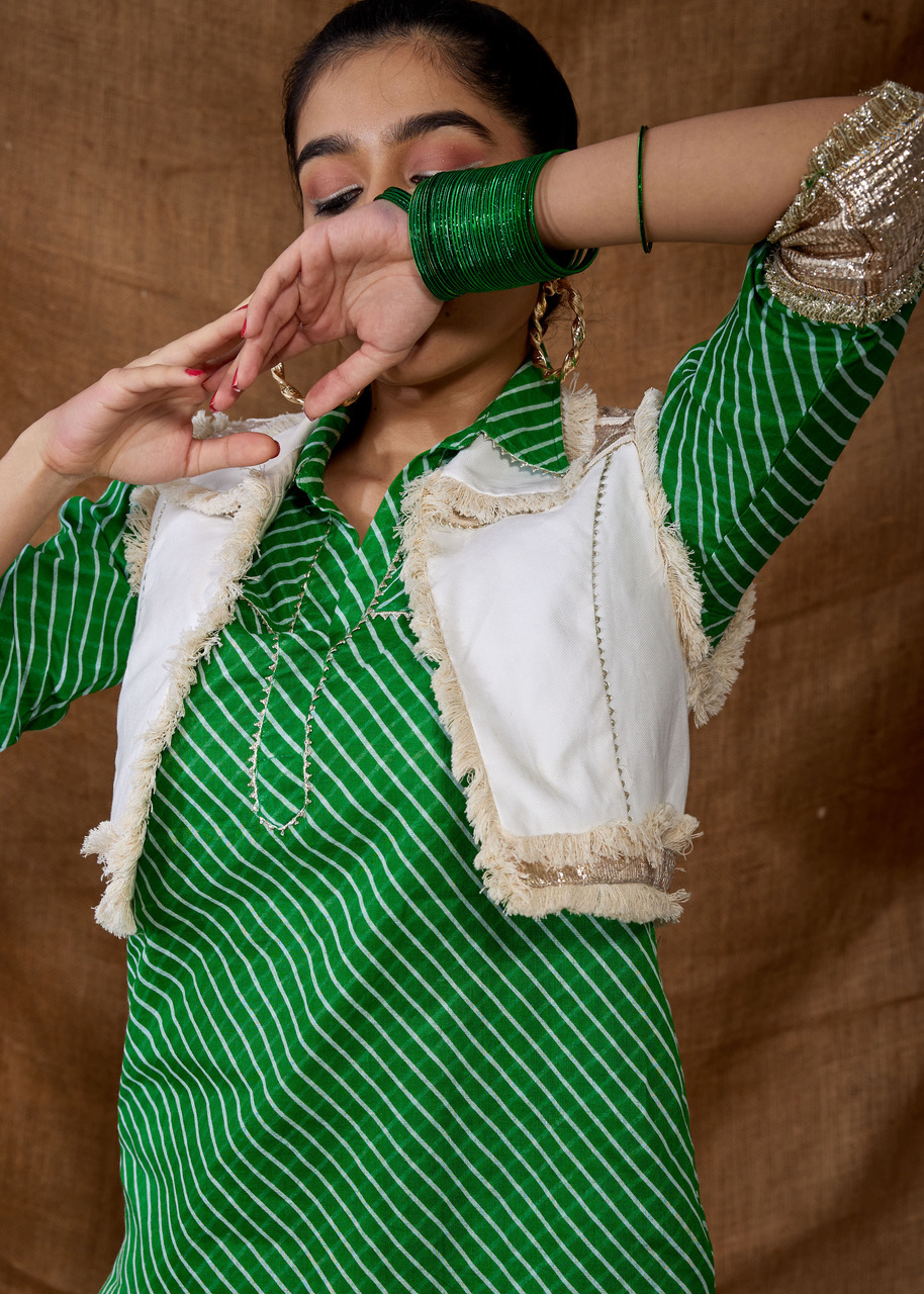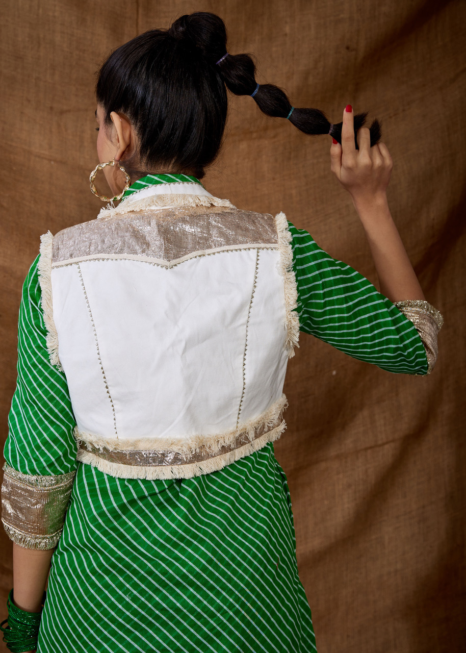STYLE TIP: Pair the GD cropped jacket with the summer whites kurta and Frida pants in chambray for a Desi Stevie Nicks look!