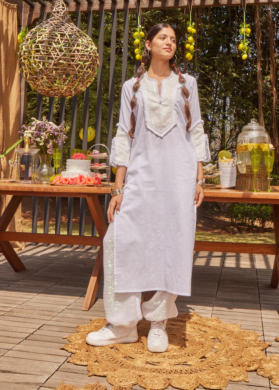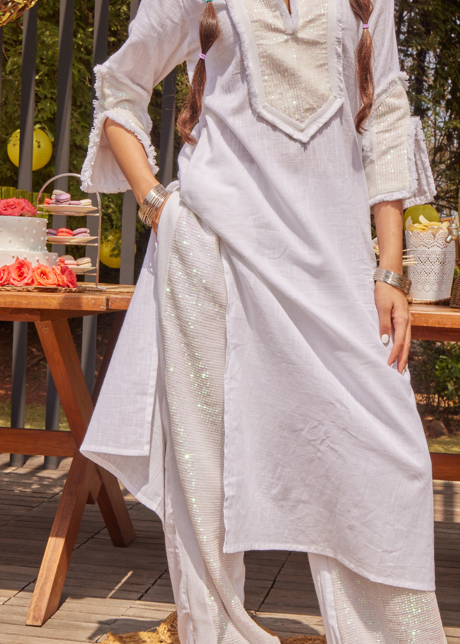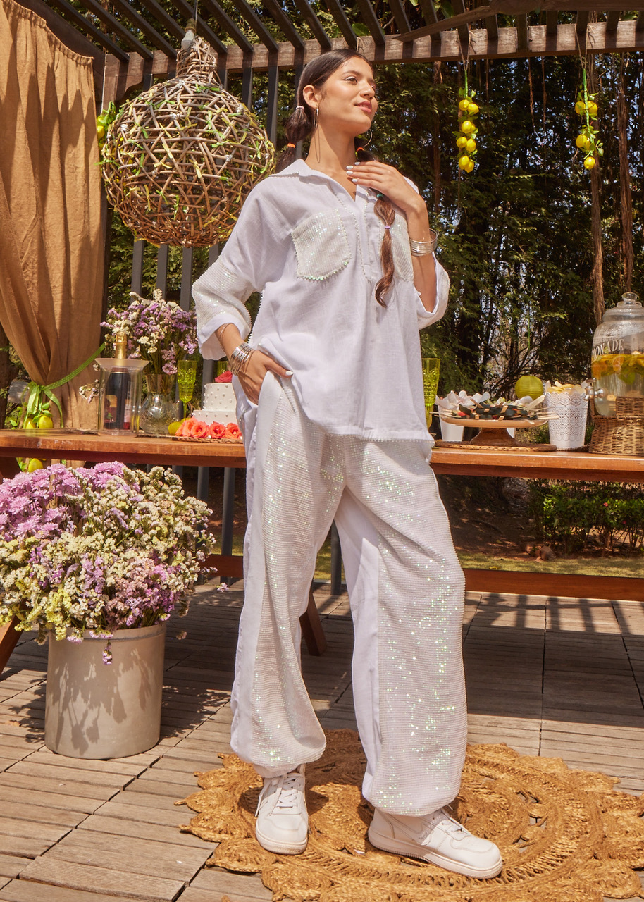 Athleisure with an Indian touch. The White Dazzle Joggers are highlighted by their rainbow sequins and louche look – looks good styled with a tee or a kurta, equally! Crafted from pure cotton.