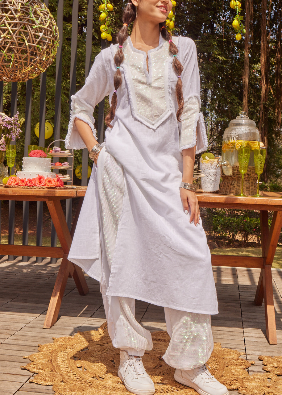 The kurta gets a street-style upgrade with our White Dazzle Kurta. Highlighted by rainbow sequins and fringing, this is a great way to brighten any day. Highly recommended for those āmehā days!